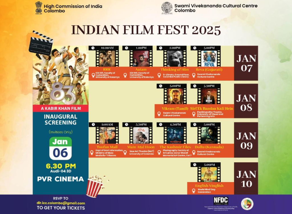 The festival will be inaugurated on Monday at 6:30 PM with the screening of the Bollywood hit ‘83’ at PVR Cinema in Colombo.