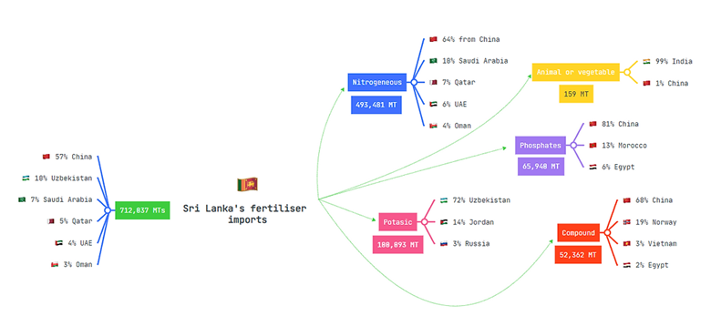 - 57% of Sri Lanka’s fertiliser imports came from China. China is the world’s 2nd largest fertiliser exporter. China is the largest source of Urea (56%) and Ammonium Sulphate (99%) imports to Sri Lanka. China has halted fertiliser exports to preserve its own food production and security.