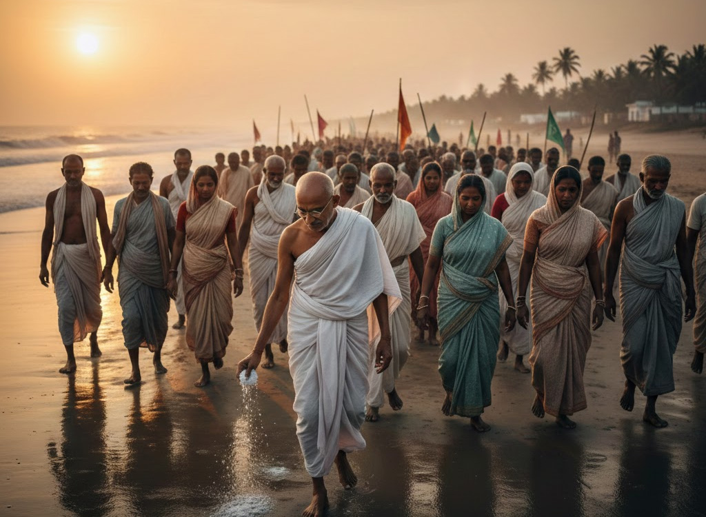 Gandhi and his followers walked nearly 390 km along India’s western coastline, passing through villages, fields, and towns. They encountered farmers, fishermen, and families who observed or joined the journey.
