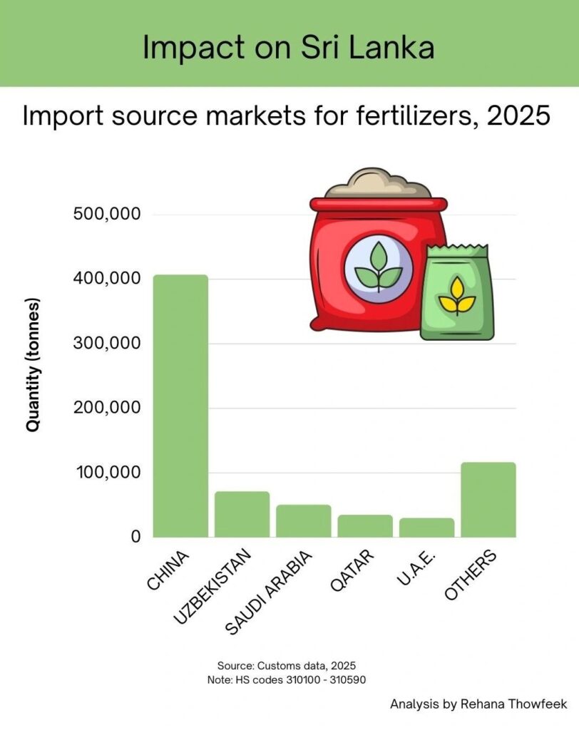 The depth and persistence of any impact will depend on how long the war will go on for and how much it will escalate in terms of regions. However, there is a significant impact on global supply chains due to the war and the closure of the Strait of Hormuz, a critical maritime chokepoint (about 38% of crude oil, 29% of LPG and 19% of LNG pass through the strait). The impact on Sri Lanka also depends on where we are sourcing our imports. I put together the top five import source markets (based on 2025 import data) for oil, coal, gas and fertilizer to get an idea of the potential impact on Sri Lanka.