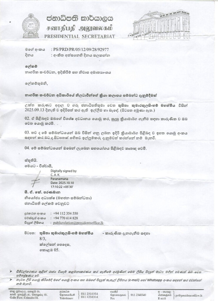 The Presidential Secretariat has said the complaint has been referred to the relevant sectors for action.